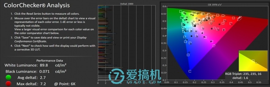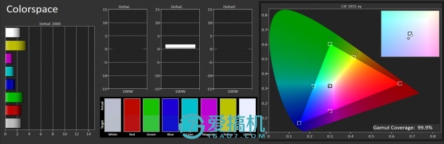 标准模式下,sRGB色域为96.4%;104色平均DeltaE为2.7,最高DeltaE为7.2。智能模式下色温约为8900K;sRGB色域为99.9%;104色平均DeltaE为3.8,最高DeltaE为8.8。整体观感还可以,虽然客观数据确实不够突出,但也符合这个价位机型应有的表现,没有太多好挑剔的。