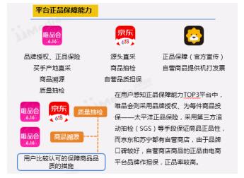 iiMedia Research(艾媒咨询)数据显示,在对用户感知平台正品保障能力的调研中,唯品会位列行业之首,京东和苏宁紧随其后。唯品会为每件商品投保太平洋正品保险,唯品会和京东均有商品抽检环节。