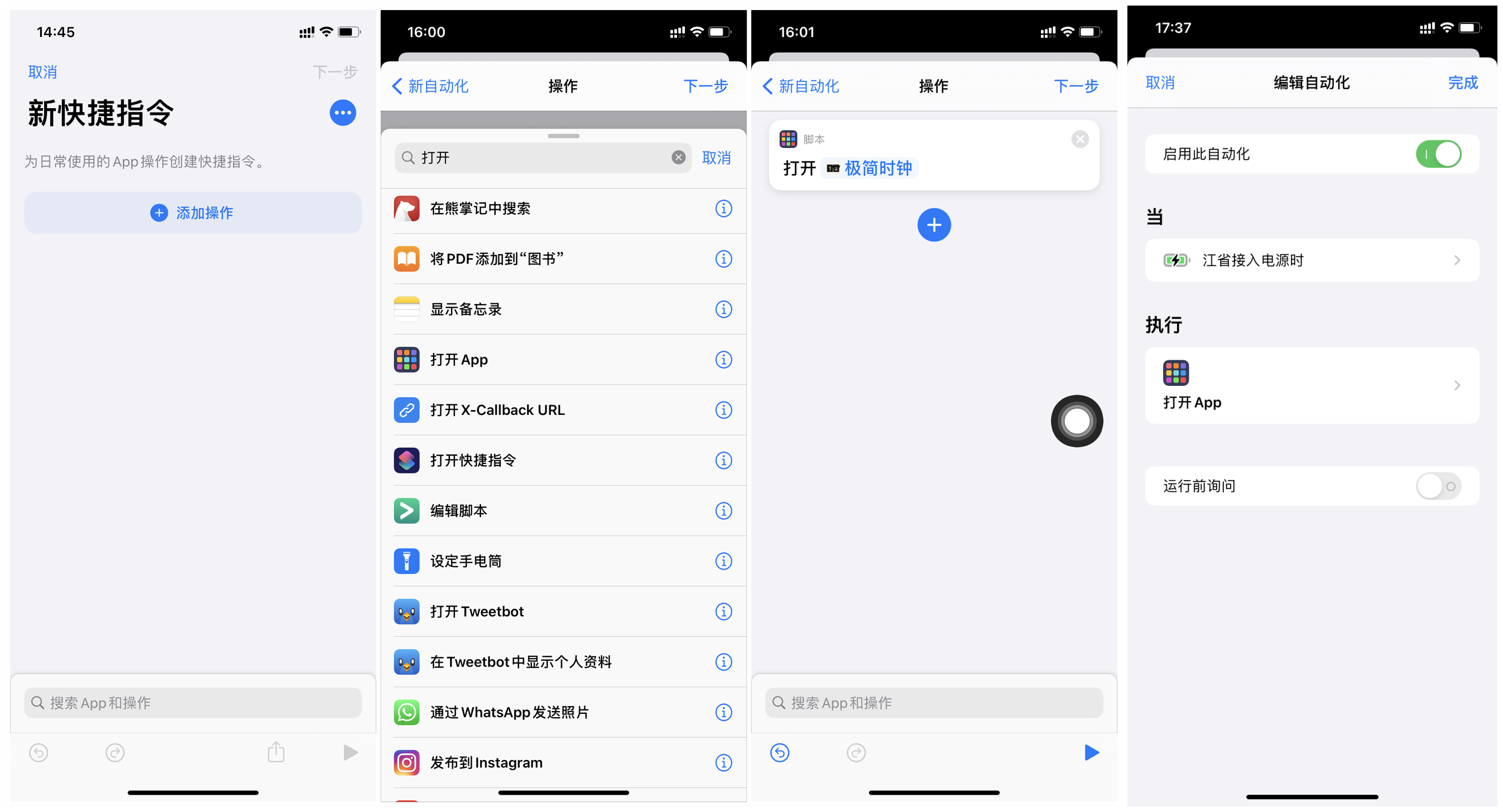 再点击下一步,选择【添加操作】,搜索”打开”选择打开APP,再添加一下极简时钟,最后一步就是关闭”运行前询问”这个提醒,方便我们充电的时候直接进入时钟页面。