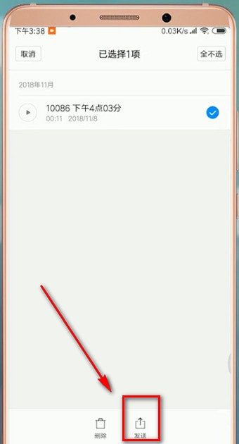 1.首先打开录音文件,长按录音文件,选择下方的【发送】,