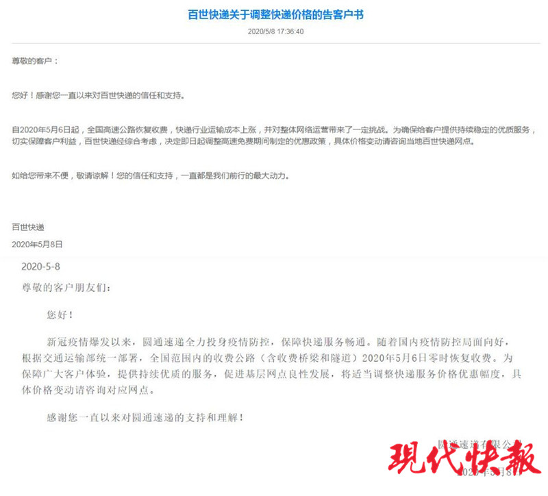 5月8日,申通、圆通、百世等快递公司官宣,因全国范围内的收费公路(含收费桥梁和隧道)于5月6日零时恢复收费,为保障末端网点有序复产、完善客户体验,促进基层网点良性发展,将适当调整快递服务价格优惠幅度,具体价格变动请咨询对应网点。对此,现代快报记者了解了南京市场,目前部分快递小哥和网点还没有接到通知。业内人士分析,此价格变动主要是针对电商大客户,个人散户可能没什么影响。