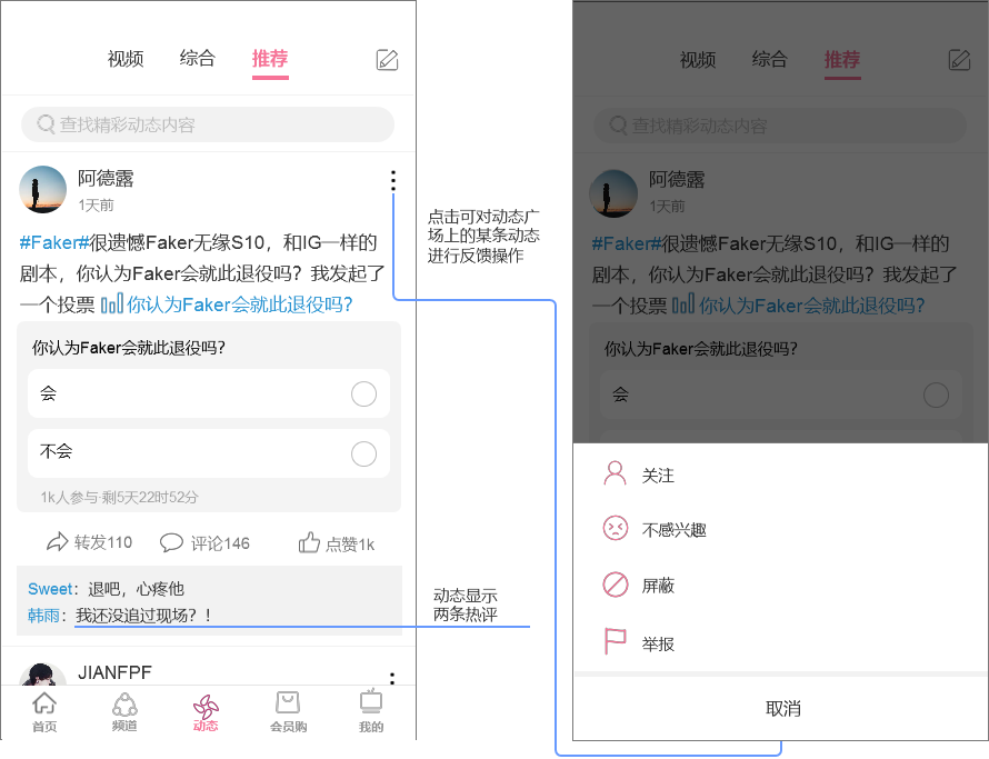 动态广场会随机推荐用户的动态,包括图文、文字和投票等等一切除了视频和专栏动态;可以对动态进行评论点赞等互动,也可以关注该用户,或进行屏蔽、不感兴趣等操作;动态显示两条热门评论,促进用户的发言。