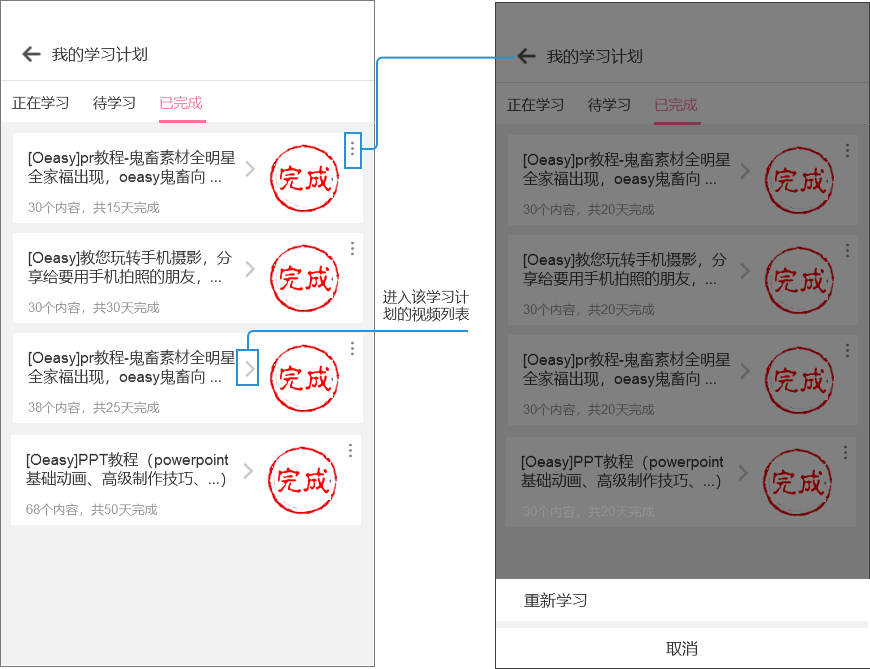 正在学习的学习计划可以转为待学习学习计划,修改学习计划、也可以直接删除;待学习的学习计划可以开始学习,也可以删除;已完成的学习计划可以重新学习。