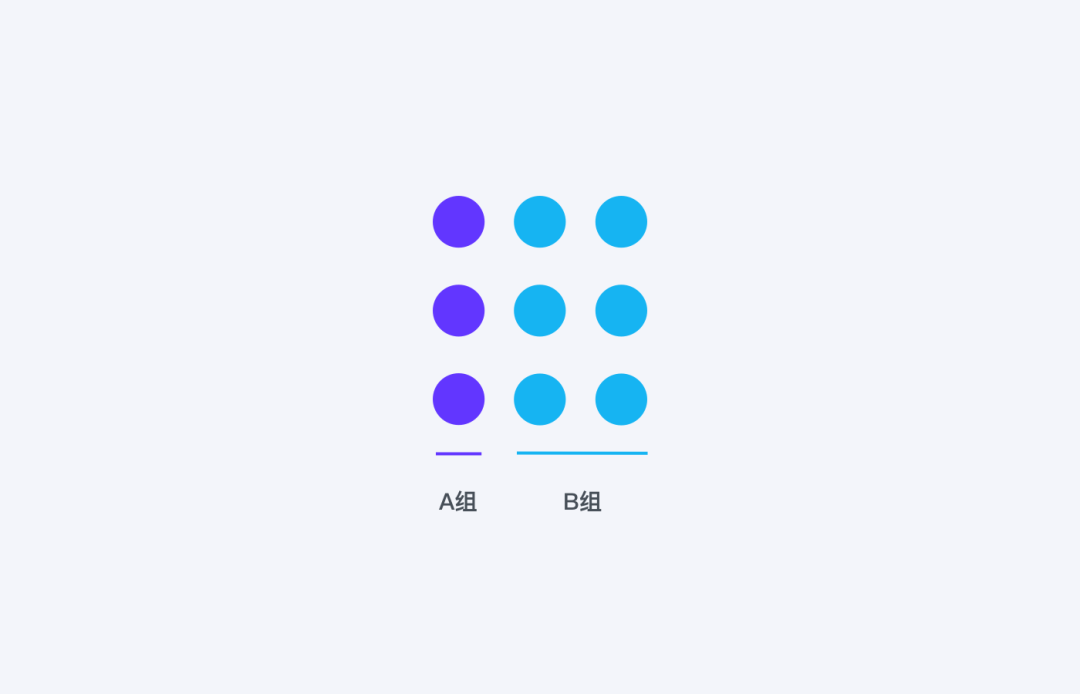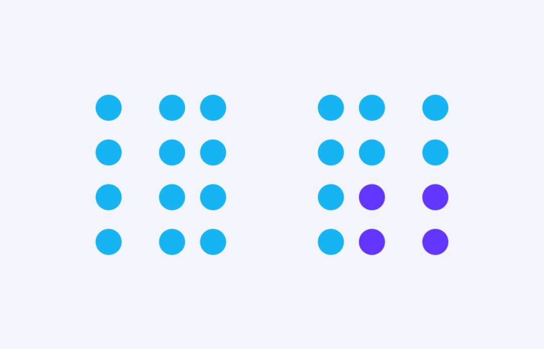 上图中左侧虽然间距大小一样,但是色彩不一样,我们视知觉会自动将两种颜色分别视为两组。