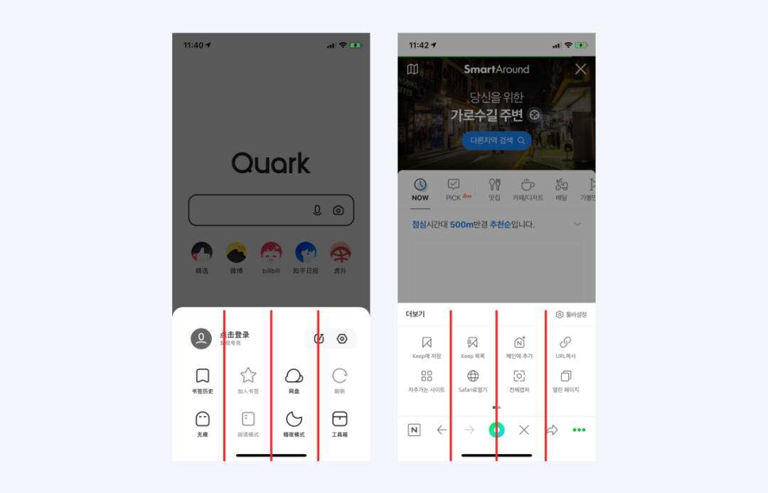 在夸克和Naver产品设计中,底部图标网格菜单,采用对称平衡手法,将功能排布在宫格列表上。