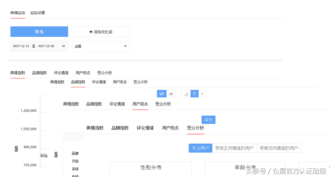 企业基础认证成功后,将会在基础数据分析中看到新增的品牌指数、用户观点、受众分析等,同时这些数据支持报告导出哦。;如今,舆情功能已越来越成为企业进行品牌营销、数据分析的重要依据。