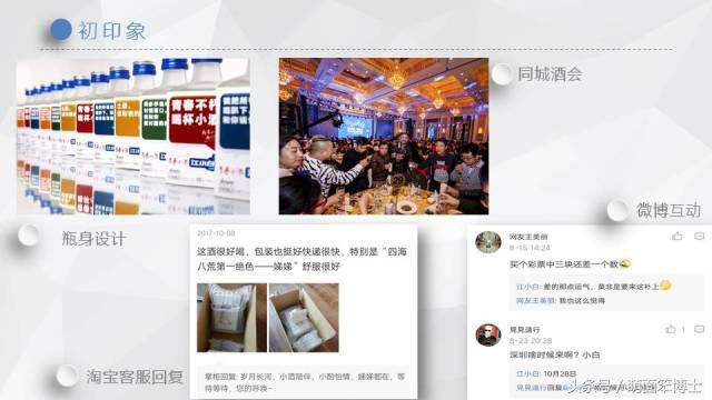 通过瓶身设计可以看出,江小白并没有走传统白酒高端路线,而是更加的接地气,重视与消费者的互动,从它的微博和客服,以及经常举办的酒会等各种活动都可以发现,江小白试图用年轻的思维打入到现代年轻人中去,因此,得到了许多年轻消费者的青睐,从11年发展到现在,其成绩已经让同行刮目相看。