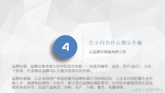 江小白除了在营销方面取得佳绩,在企业经营的每个环节都付出了心血。品牌价值链:以企业向用户承诺的最终品牌价值为导向和目标,从企业经营的整个业务链入手,梳理和改善每一个环节,使之符合品牌价值的要求。这样的价值链贯彻企业经营的所有环节,包括产品研发、采购、生产、分销、服务、传播等等。就像江小白酒业的CEO陶石泉所说,在开拓市场时,轻易不会去咬一个新市场,但一旦咬下去会坚持很长的时间。江小白也从来不会去肆意拓展目标群体,但无论遇到多大的困难,都咬住不放,让客户和员工明白无误地了解这种懂得坚持、咬住不放的特性。