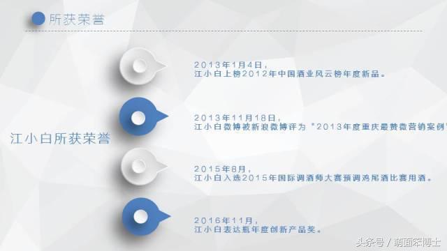 江小白一经推出便受到了很多年轻人的喜爱,上榜2012年中国酒业风云榜年度新品,江小白微博被新浪微博评为“2013年度重庆最赞微营销案例”,15年入选2015年国际调酒师大赛预调鸡尾酒比赛用酒。