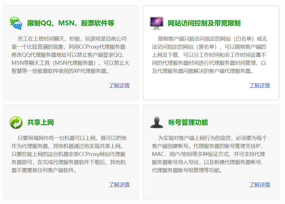 只要局域网内有一台机器能够上网,其他机器就可以通过这台机器上安装的CCProxy来共享上网,最大程度的减少了硬件费用和上网费用。只需要在服务器上CCProxy里进行帐号设置,就可以方便地管理客户端代理上网的权限。在提高员工工作效率和企业信息安全管理方面,CCProxy充当了重要的角色。