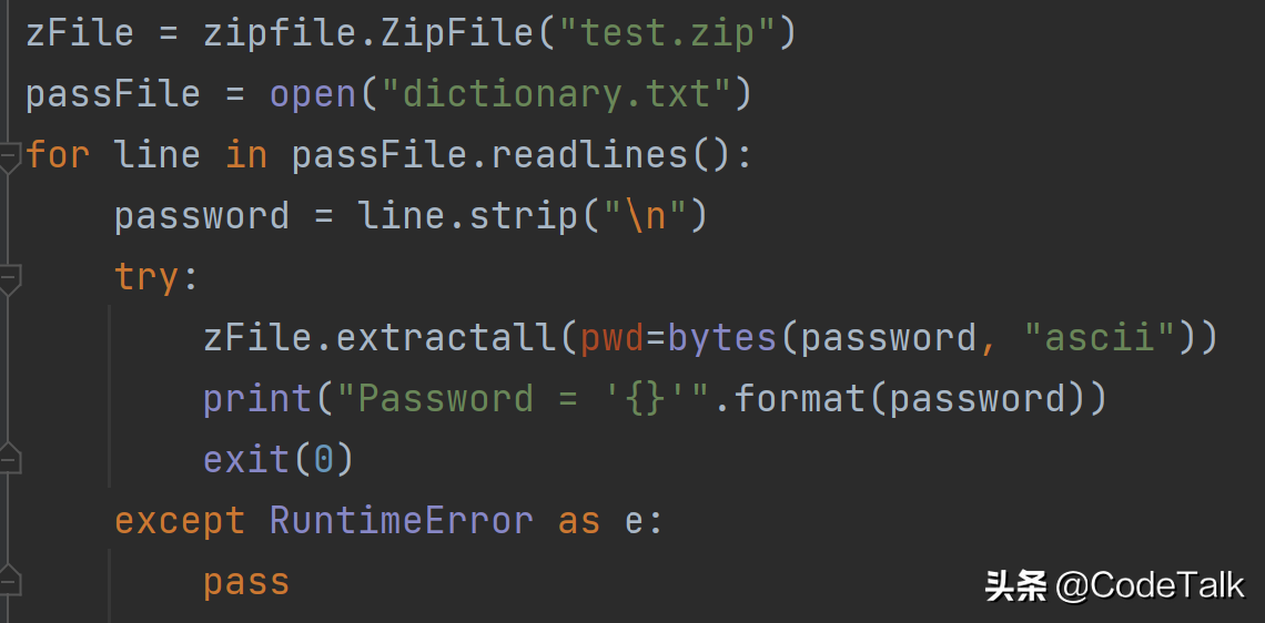 密码破解的一个常用手段就是使用密码字典。密码字典通常是一个文件,里面保存着大量常用密码。我们通过对字典用的密码进行遍历,如果真实密码出现在密码字典中,那么就可以成功破解。具体代码如下: