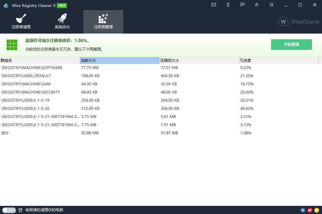 它提示说当前您的注册表基本无冗余,建议下次再整理。说明我的注册表还可以不用整理,为了演示一下效果我就点击开始整理看看。