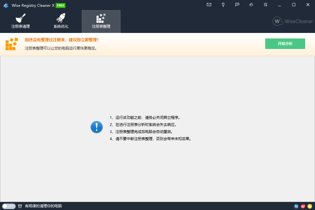 进入软件界面有注册表清理,系统优化,注册表整理,三个选项卡。