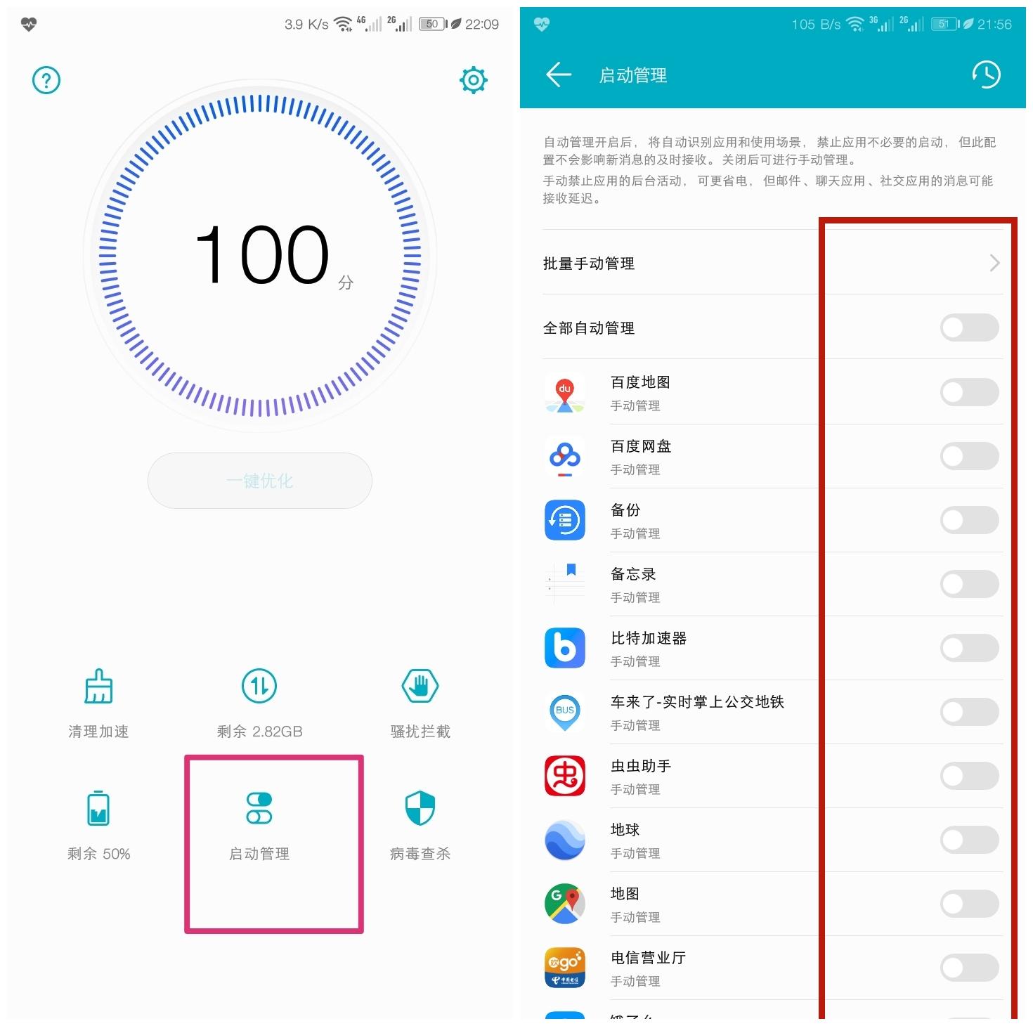 或者是手机管家,手机自带预装的助手之类的APP,会有一个禁止自启,把你想设置的软件拉到白名单,允许自启而且不会被优化加速误伤。
