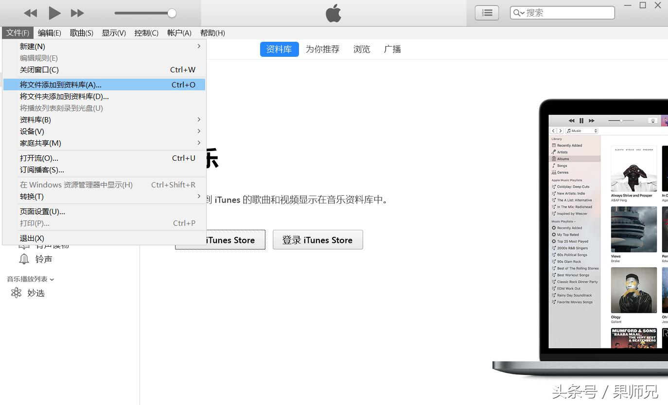 2、安装好之后,打开iTunes,把你喜欢的音乐导入进去(提前下载好的音乐);直接拉到音乐资料库里面(如果不可以拖的话,那就需要你点击左上角的文件,在里面选择将文件添加到资料库就可以啦);