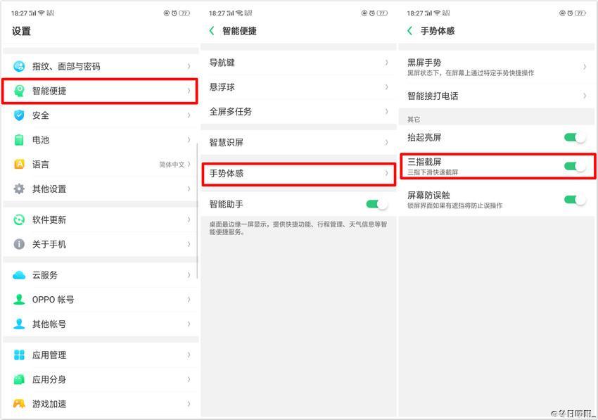 这种方法是OPPO手机独有的截图方式,在【设置】中打开【便捷辅助】,然后选择【手势体感】中的【三指截屏】然后在手机屏幕上用三个手指上下快速滑动即可截屏。值得一提的是,这种方式可以随便截屏幕中的哪个位置,只需要将手放在哪里,就从哪里开始截。