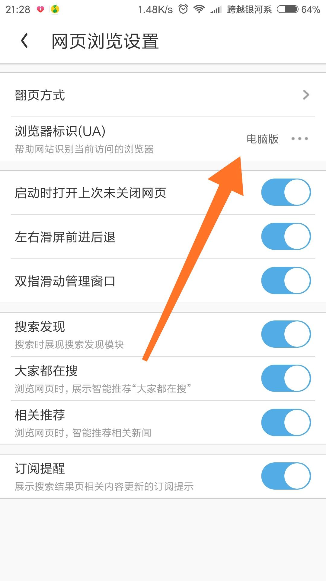 3.点击【浏览器UA标识】,对手机浏览器模式进行切换。