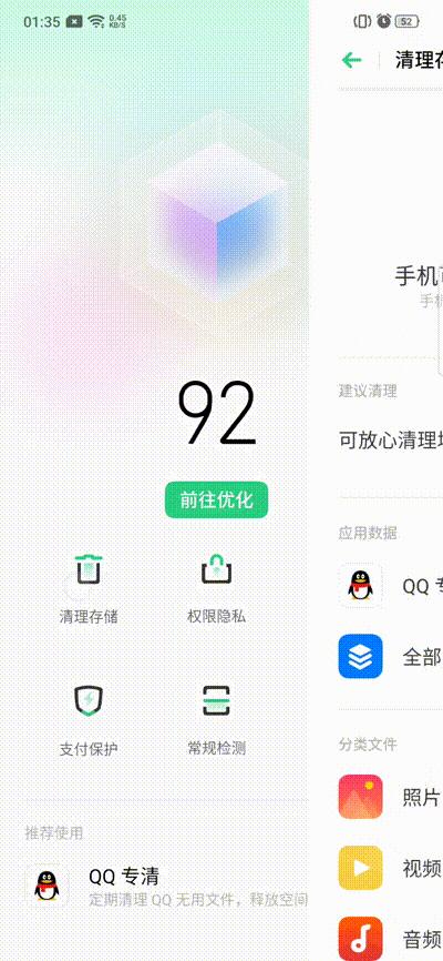 比如LBE安全大师的清理功能,或猎豹清理大师。都有双重清理功能,既可清除运行内存,也可以清除程序缓存、垃圾文件,并且都有深度清理功能,可以发现占空间特别大的文件予以清除。